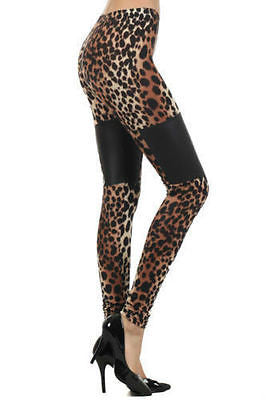 Leggings Leopard Faux Leather Panel High Waist Print Womens