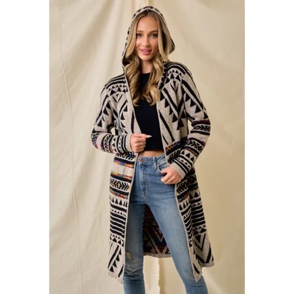 Oatmeal and rainbow multi colored aztec western printed jacquard open cardigan long sleeve sweater with hood